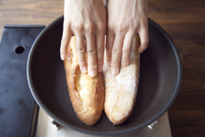 フライパンを強めの中火で熱し、 バタールの内側をフライパンで焼く。