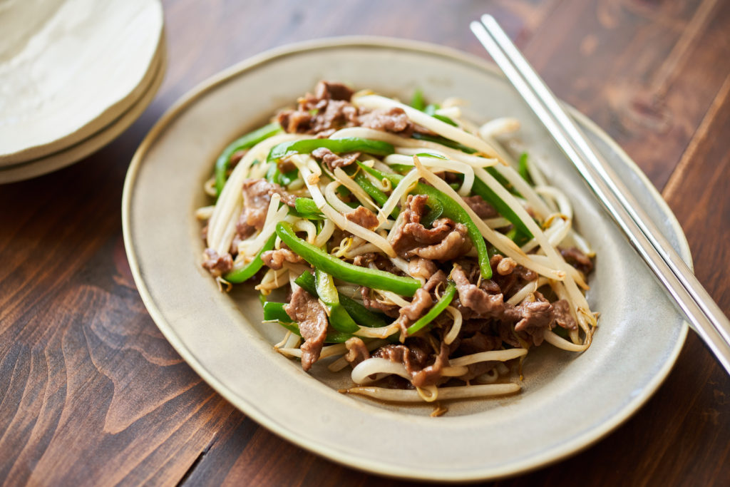 肉の色がほぼ変わったらピーマン、もやしを加えてさっと炒め、