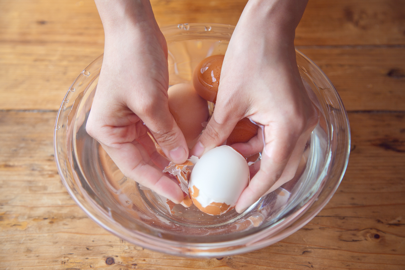 ・水の中で殻を剥くことで、殻と白身の間に水が入り、むきやすくなります。