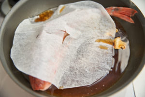 落とし蓋(クッキングシートを丸く切って中心に切り込みを入れたもの)をして沸いている状態で7〜8分煮る。