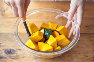 かぼちゃは一口大に切り、耐熱ボウルに入れる。