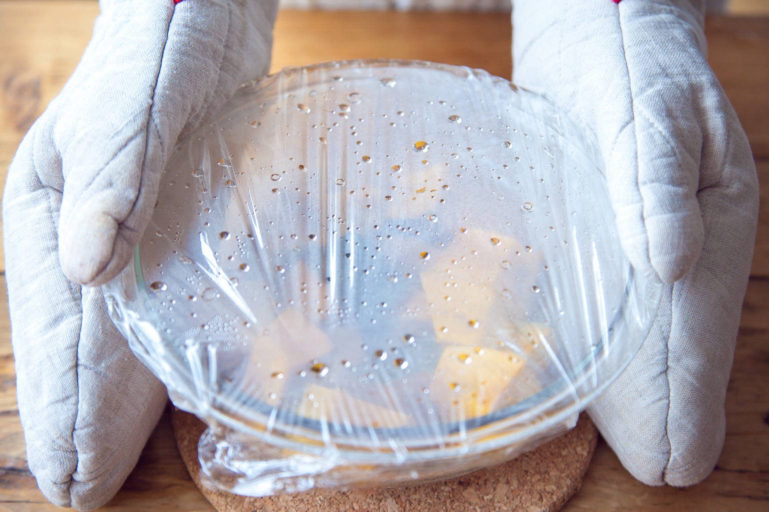 かぼちゃに竹串がすっと入るほどに柔らかくなったら、全体を混ぜ、ラップをかけたまま粗熱をとる。