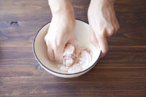 塩(分量外/ふたつまみ)、片栗粉(分量外/大さじ1) を絡ませて水洗いし、