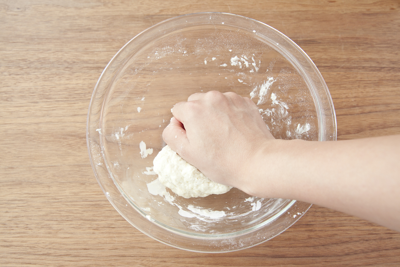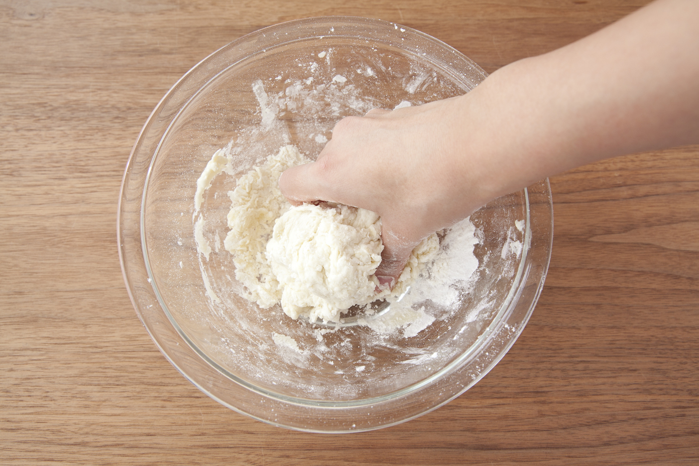 ボウルに薄力粉、ベーキングパウダー、オリーブオイル、砂糖、塩、粉チーズ、黒こしょう、水50mlを加え混ぜ、まとまったら滑らかになるまでよくこねる。