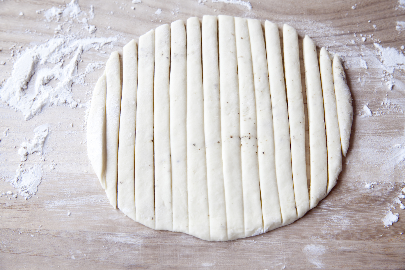 打ち粉(分量外適量)をして麺棒でのばし、包丁で1cm幅に切り、手で転がして棒状にする。