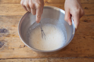 薄力粉、炭酸水をボウルに入れ、しっかりと混ぜ合わせる。