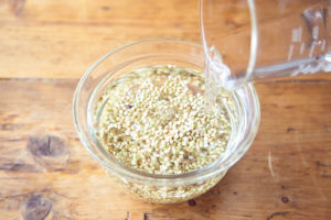 鍋にそばの実、塩ひとつまみ(分量外)、水1カップを入れて、中火にかける。