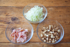 玉ねぎはみじん切り、ごぼうは7mm角、ベーコンは1cm角に切る。