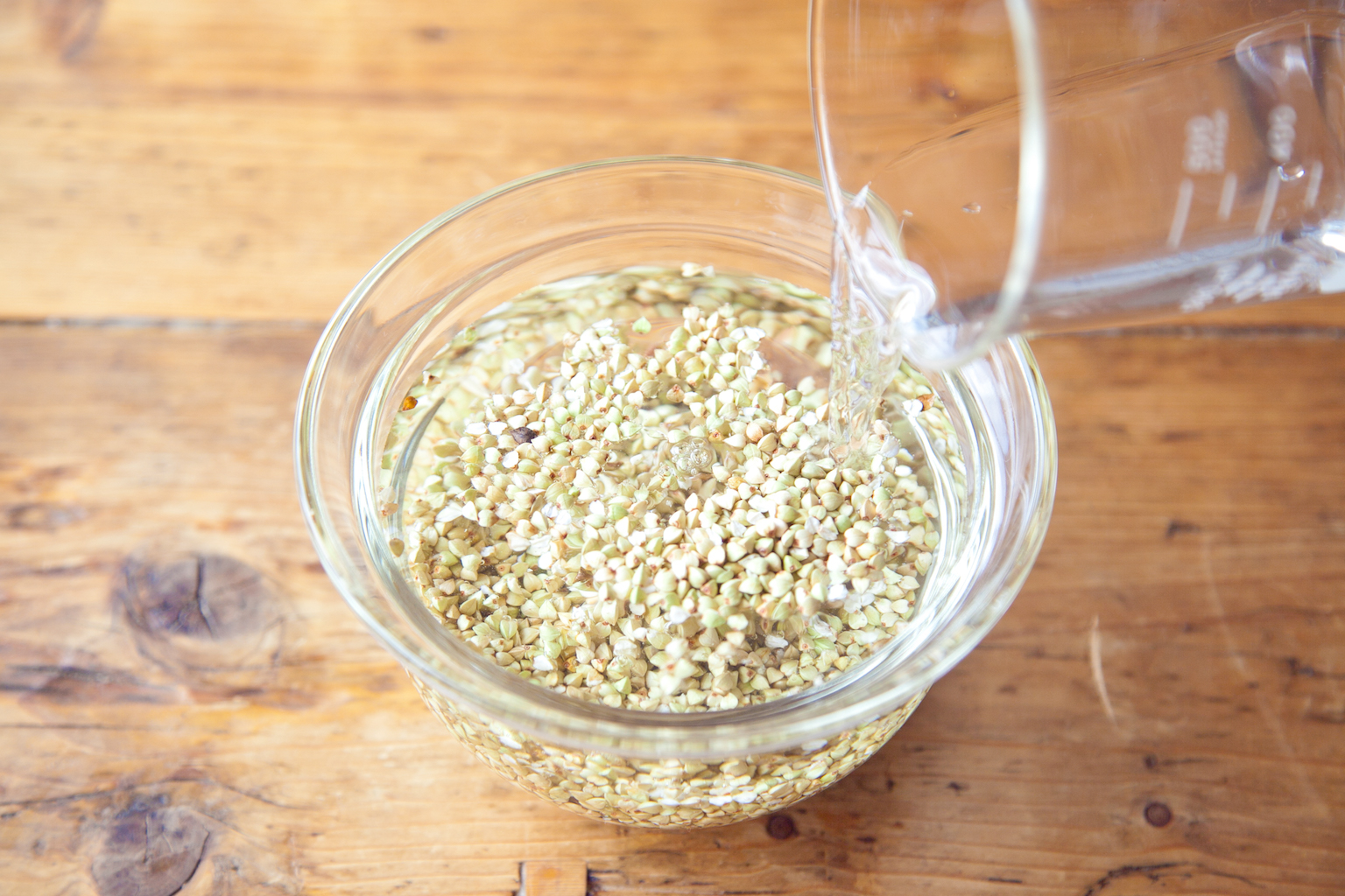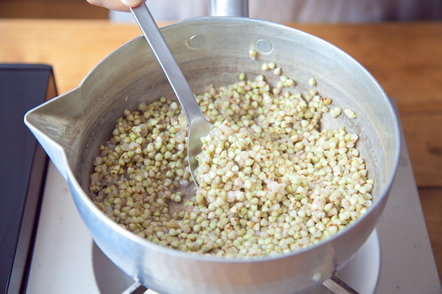 鍋にそばの実、塩ひとつまみ(分量外)、水1カップを入れて、中火にかける。