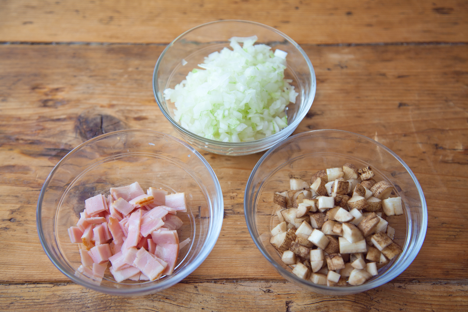 玉ねぎはみじん切り、ごぼうは7mm角、ベーコンは1cm角に切る。
