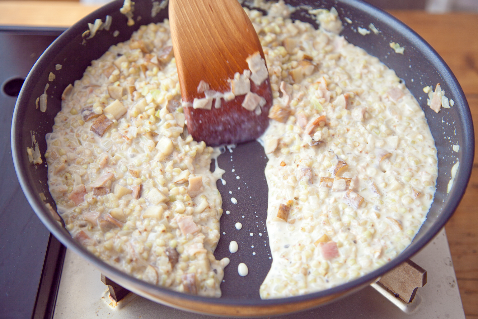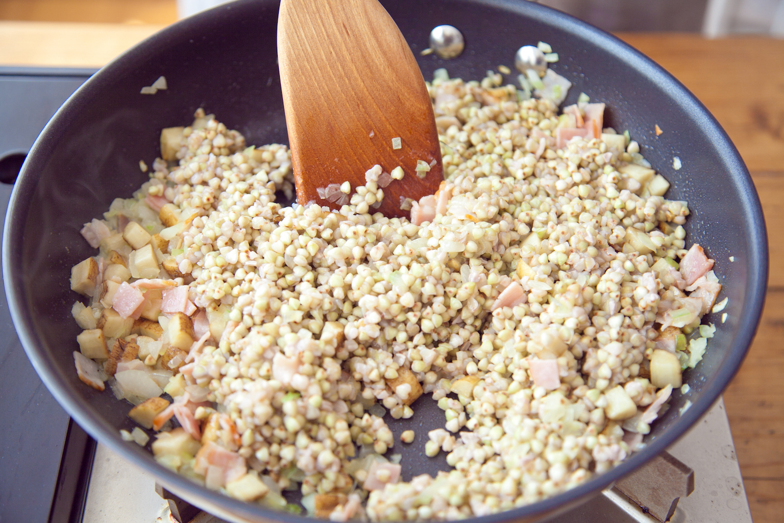 野菜に透明感がでてきたらそばの実を入れてさっと炒め、水150ml、牛乳を加え、みそを溶く。