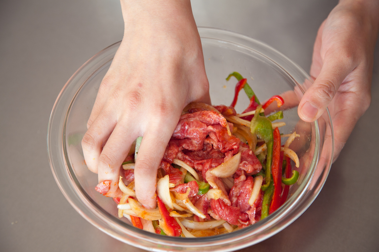 ボウルに牛肉、玉ねぎ、ピーマンを入れ、(A)を加えて揉み込み、