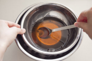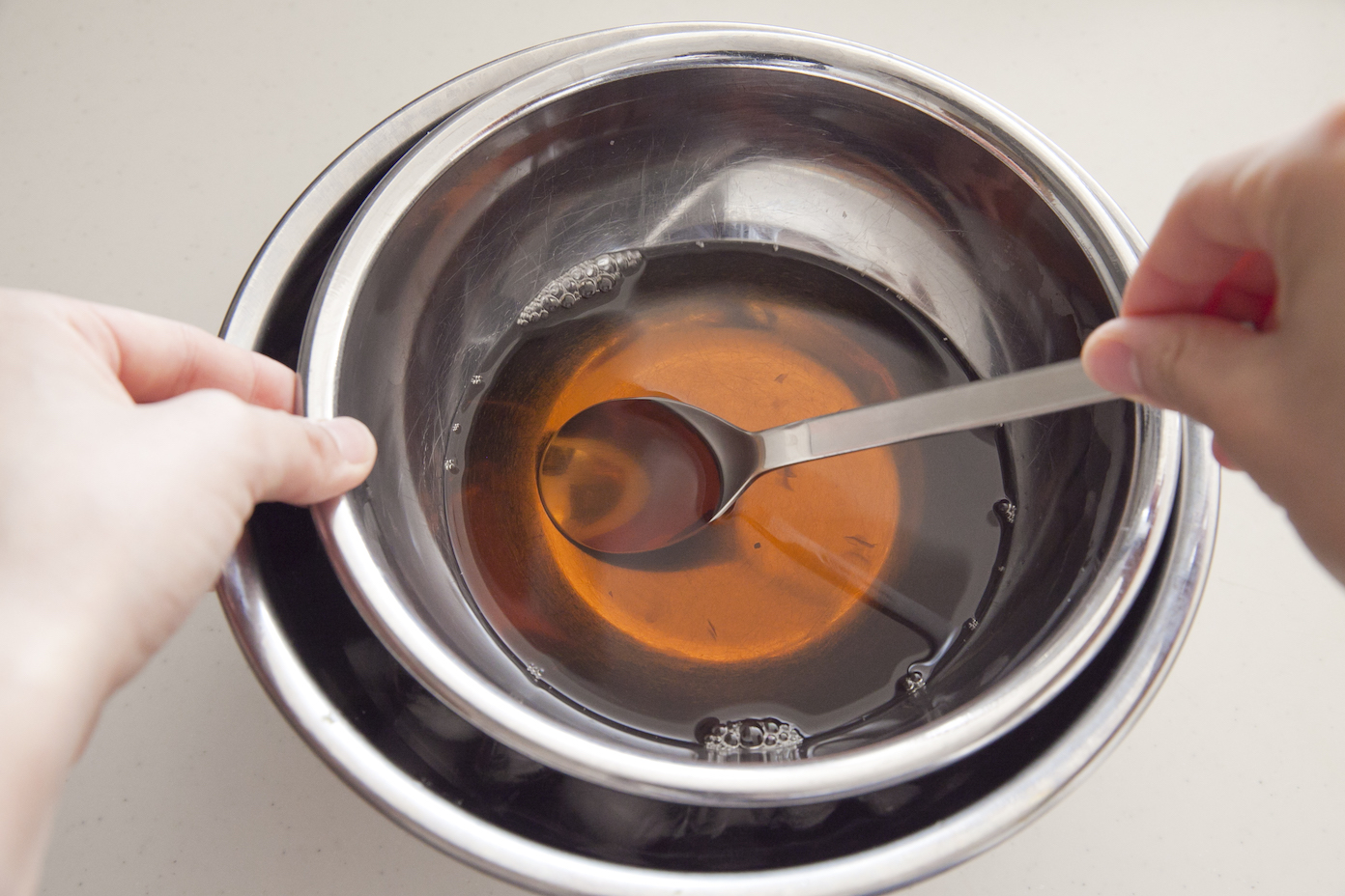 鍋にだし汁、薄口しょうゆ、ラカントS(顆粒)を入れ、煮立ったら火を止めて【1】のゼラチンを加えてよく溶かす。