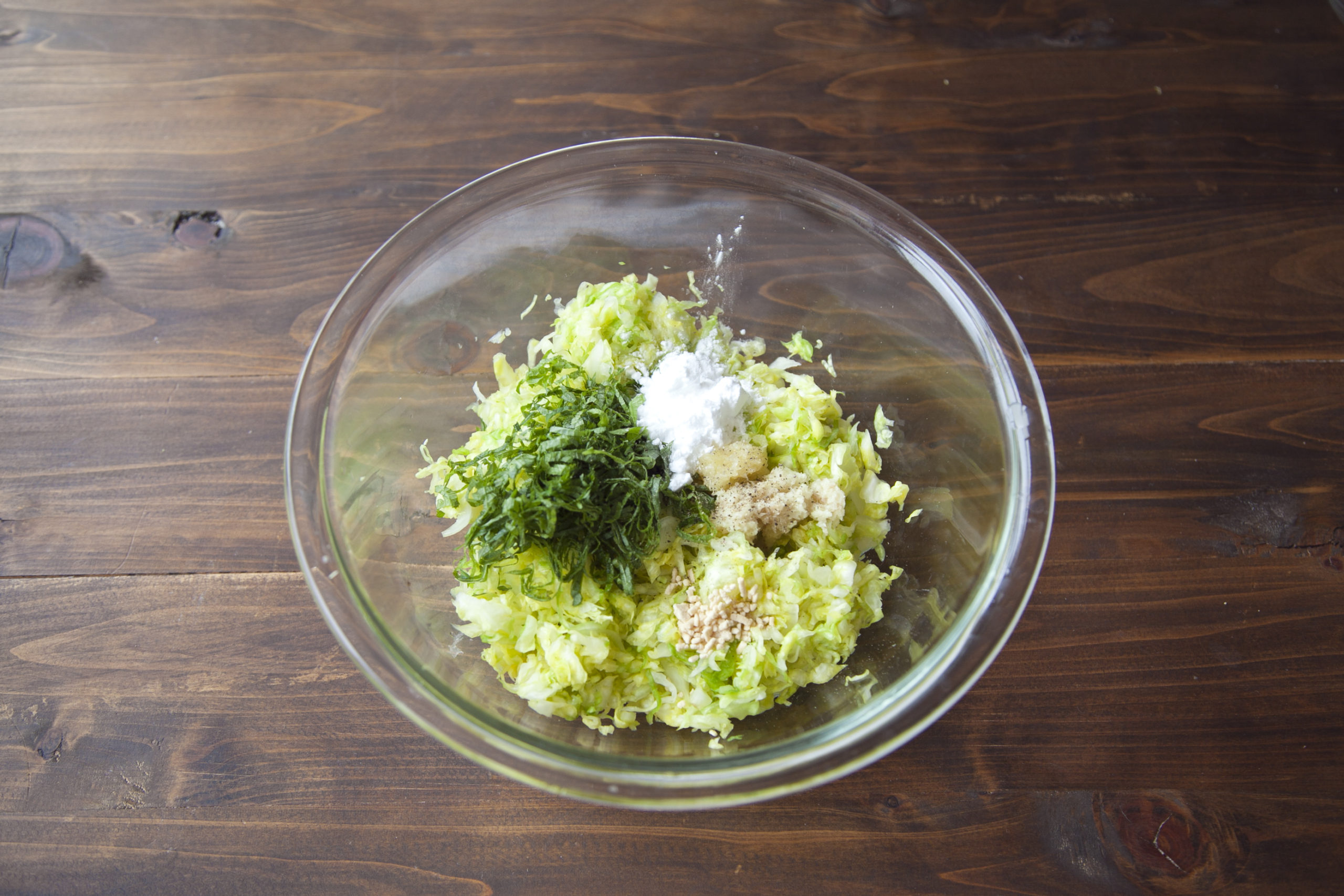 ボウルに、キャベツ、青じそ、(A)を加え混ぜる。