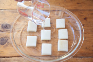 耐熱容器に餅を並べ、水1/2カップを餅にかける。