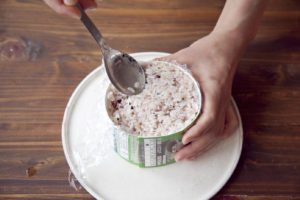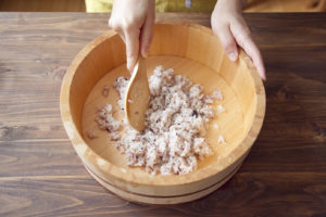 炊きたてのご飯に合わせ酢を切るように混ぜて、すし飯にする。