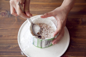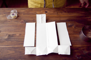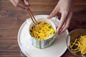 牛乳パックセルクルに大きめに切ったラップを敷きこむ。
