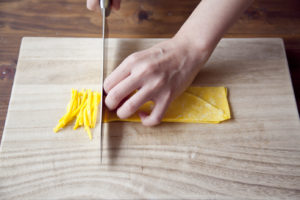 薄焼き卵は食べやすい長さの細切りにして錦糸卵にする。