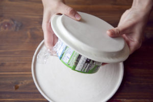 盛り付け皿をセルクルの上に置き、逆さにしてセルクル、ラップを取る。