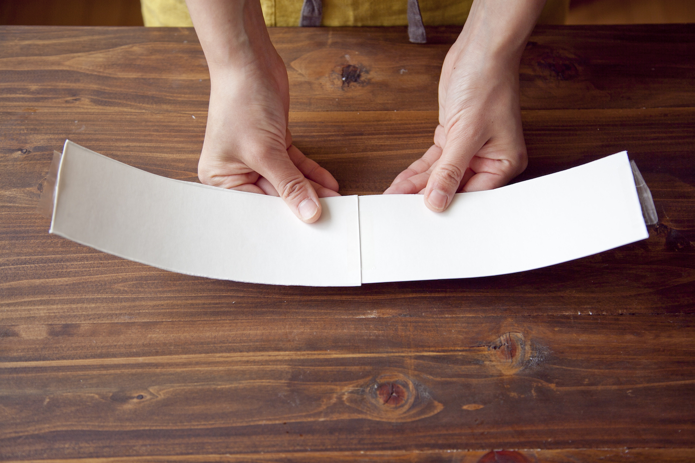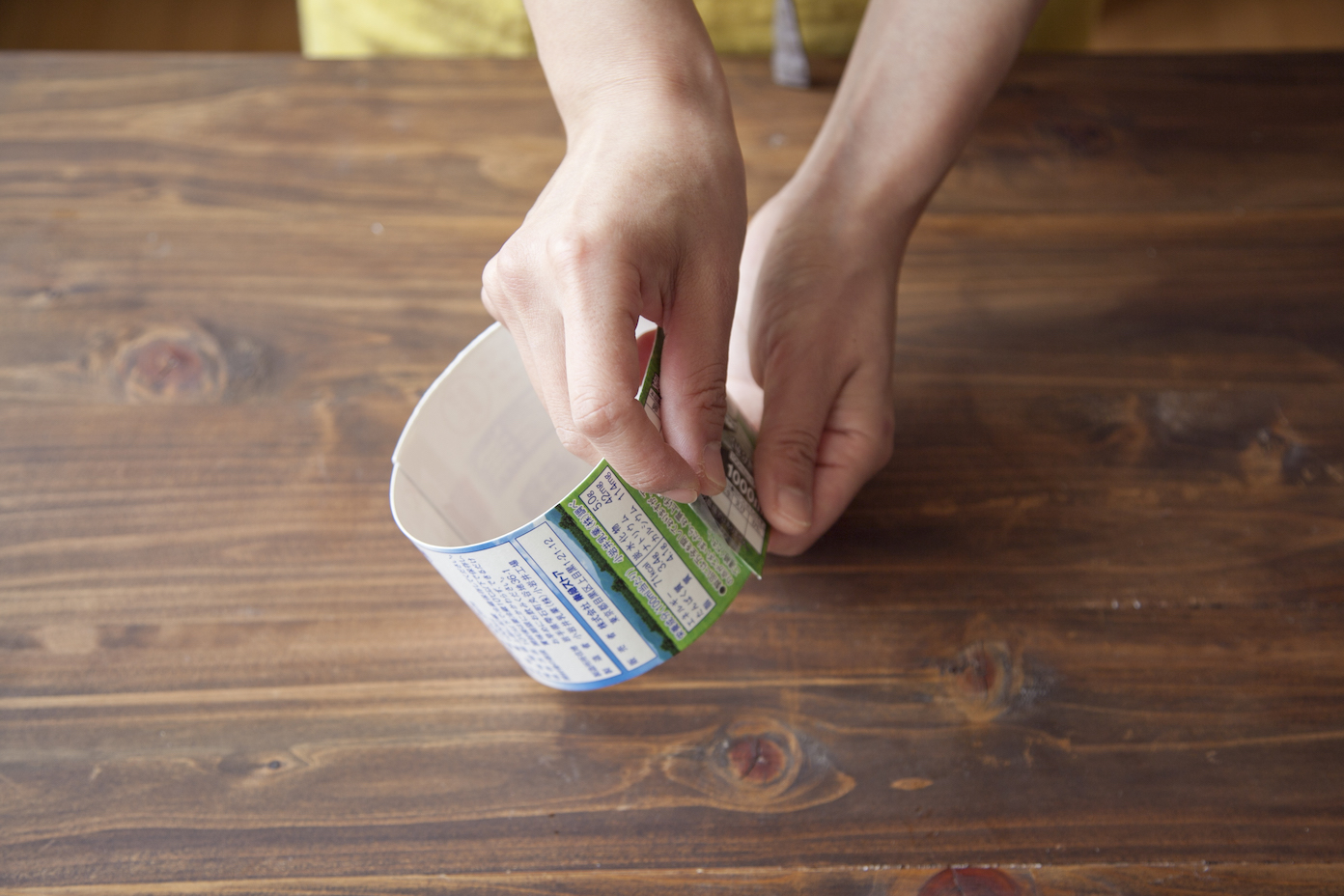 牛乳パックを開き、長方形の部分を2本切り取る。2本をテープで貼り付けて、直径10cm程度の筒型にしてテープで止める。