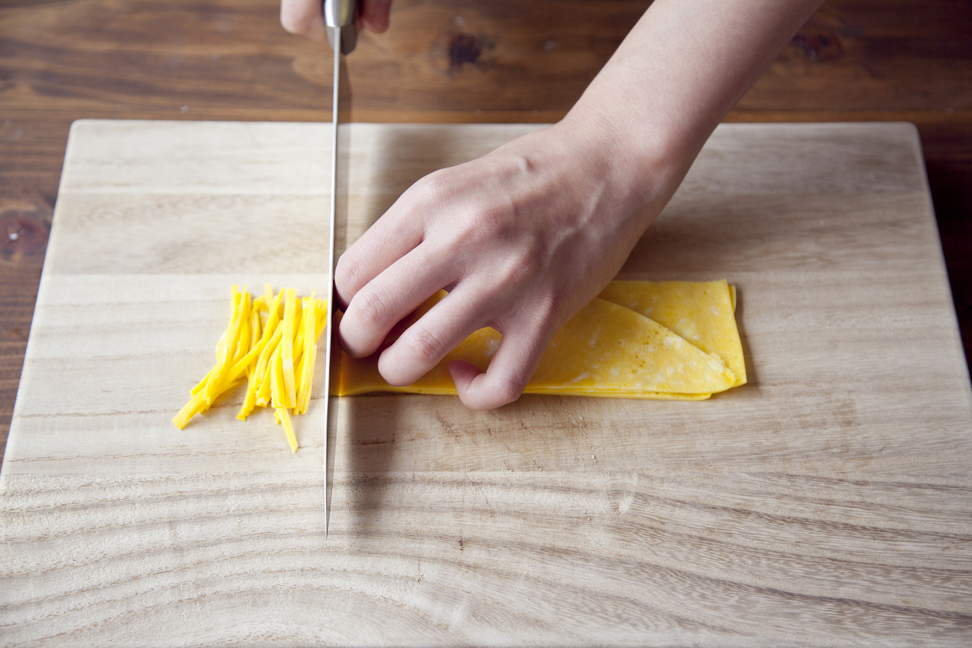 薄焼き卵は食べやすい長さの細切りにして錦糸卵にする。