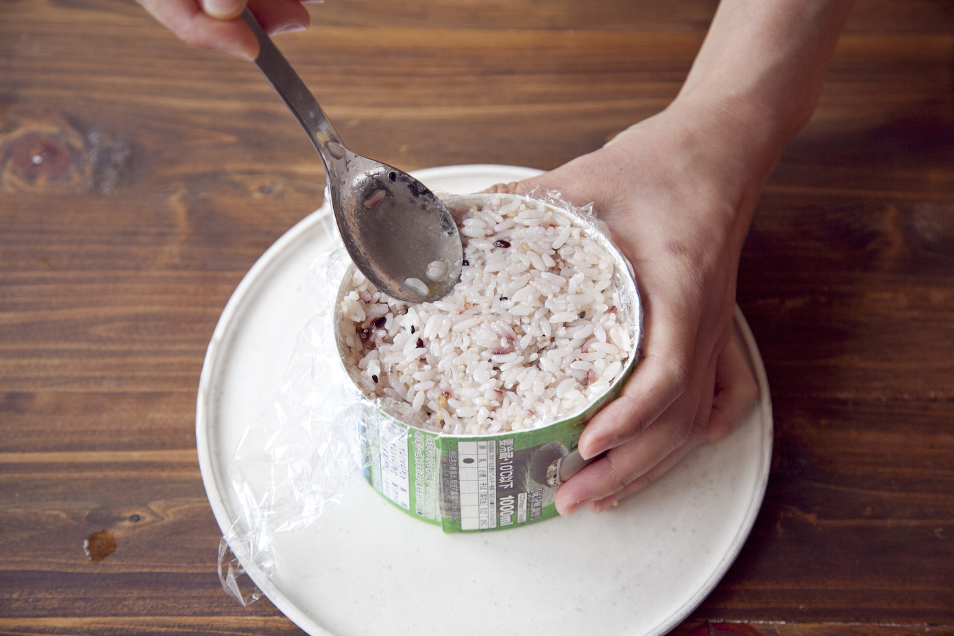 盛り付け皿をセルクルの上に置き、逆さにしてセルクル、ラップを取る。