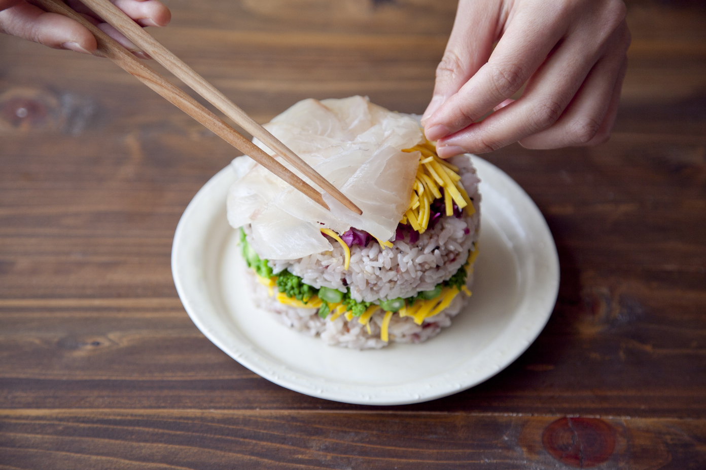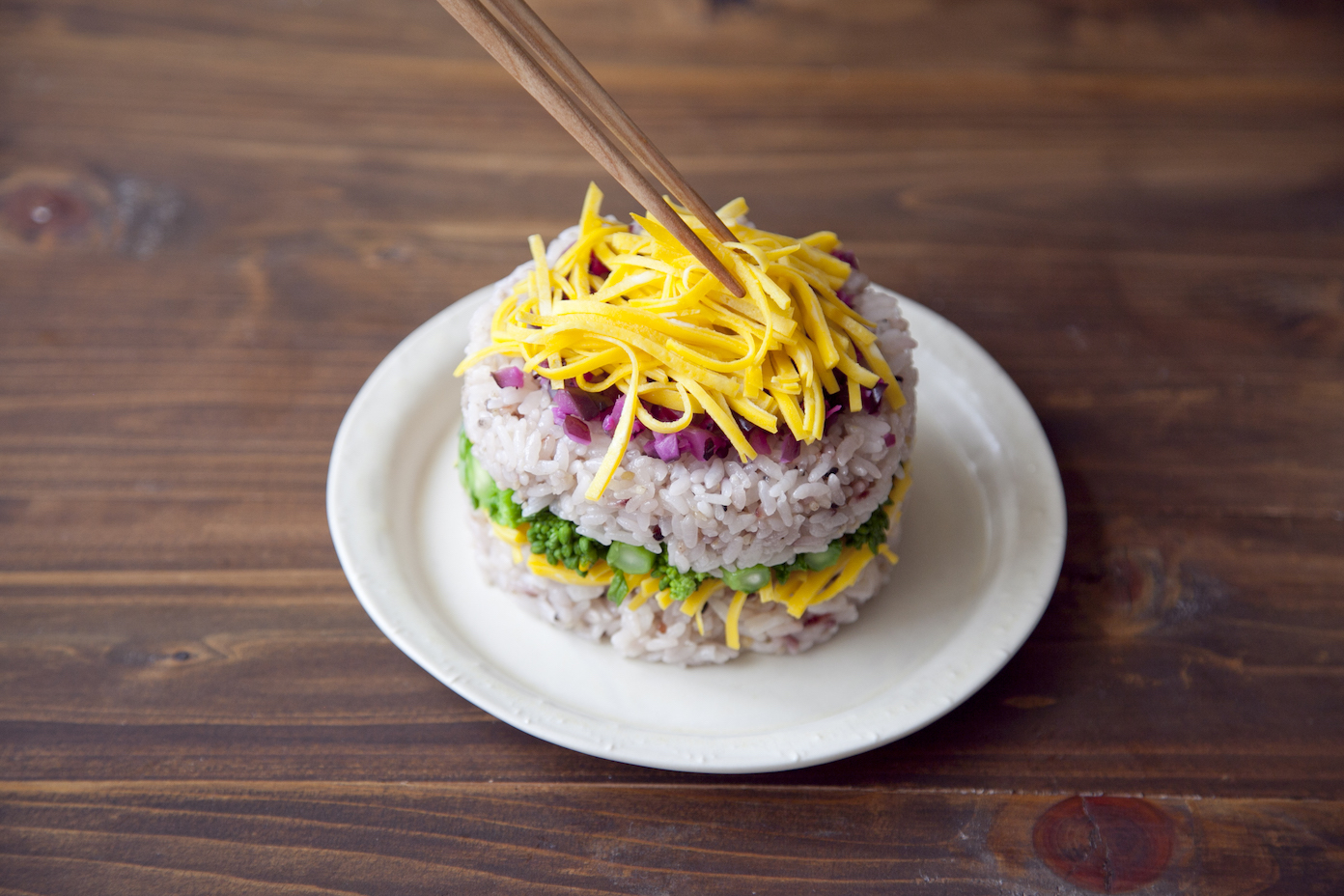 柴漬け、残りの錦糸卵、鯛を盛り付ける。