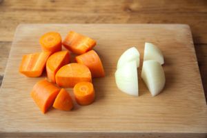 にんじん、玉ねぎは適当な大きさに切り、ミキサーに入れる。