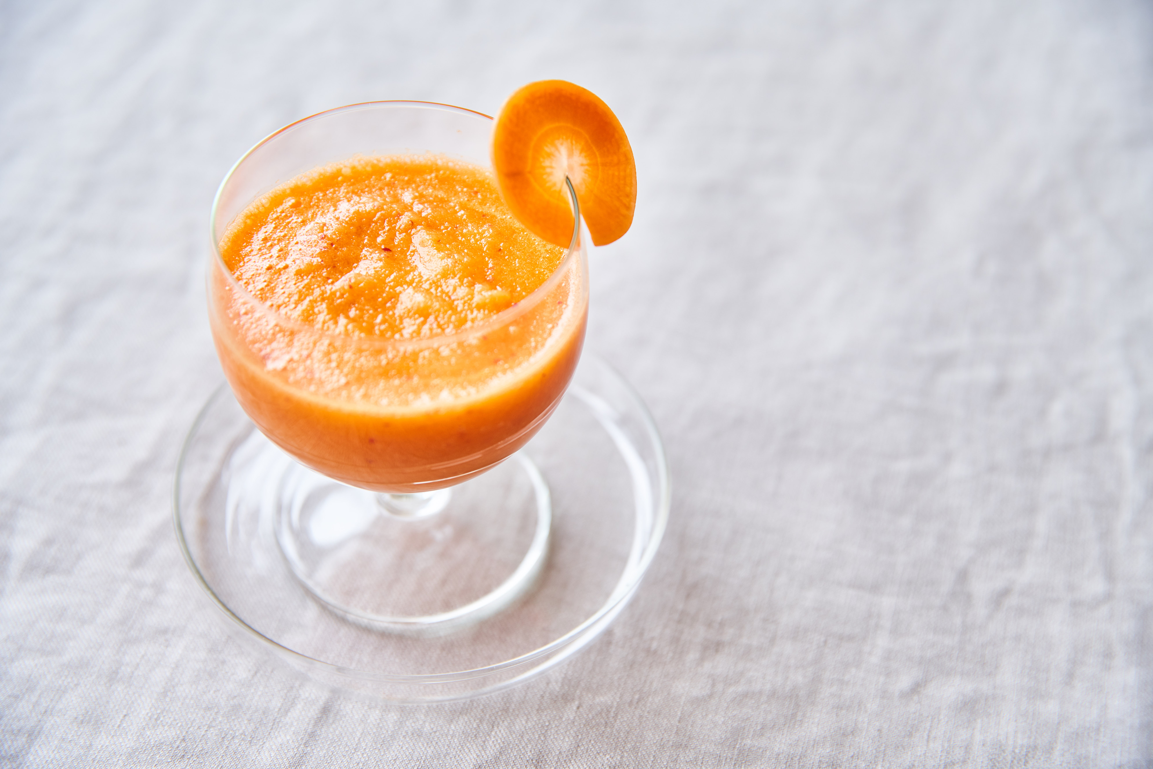グラスに注ぎ、トッピング用のにんじんを飾る。