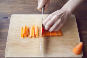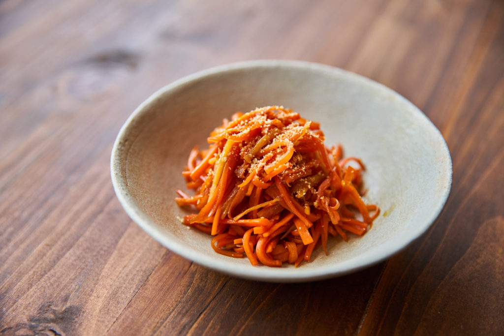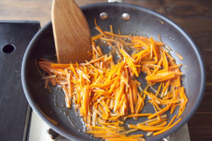フライパンにサラダ油を中火で熱し、しょうが、 にんじんの順にさっと炒め、