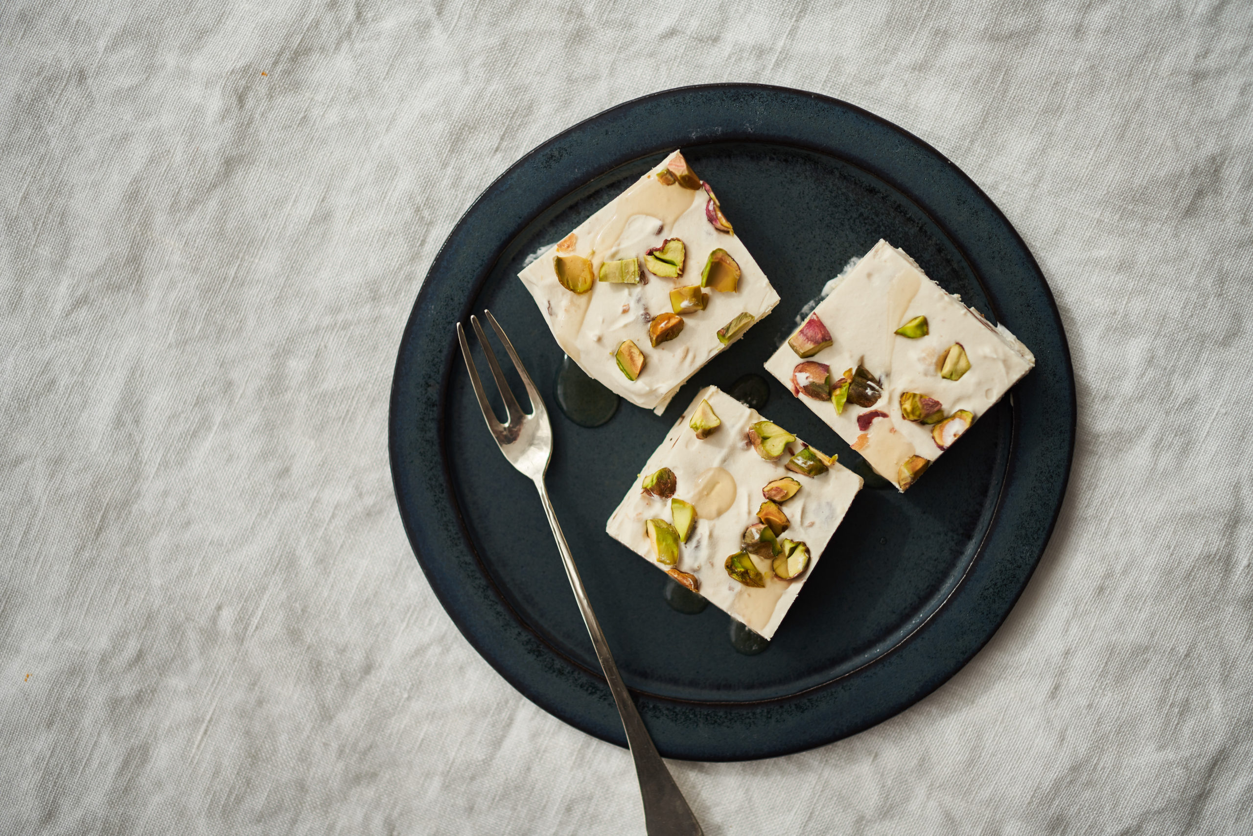 バットに2を入れ、表面をゴムベラなどでととのえてピスタチオを散らし、冷凍庫でひと晩凍らせる。
