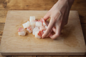 鯛は2cmの角切りにし、塩ひとつまみ(分量外)をふっておく。