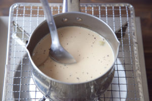 牛乳、砂糖を加え、温まったら茶こしで漉してカップに注ぐ。