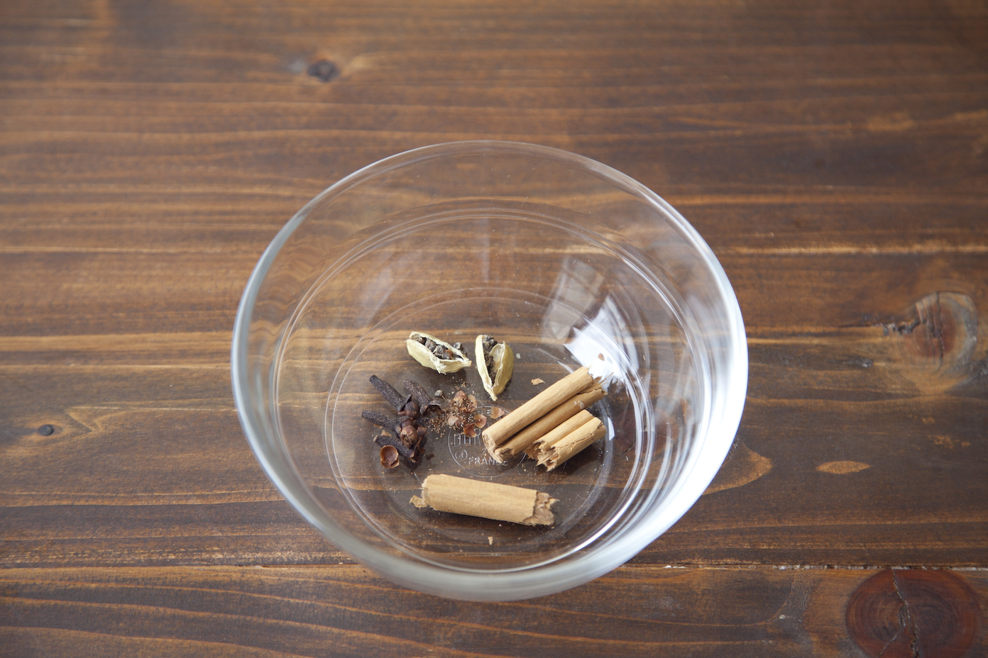 シナモンは手で折り、カルダモン、クローブは指で潰す。