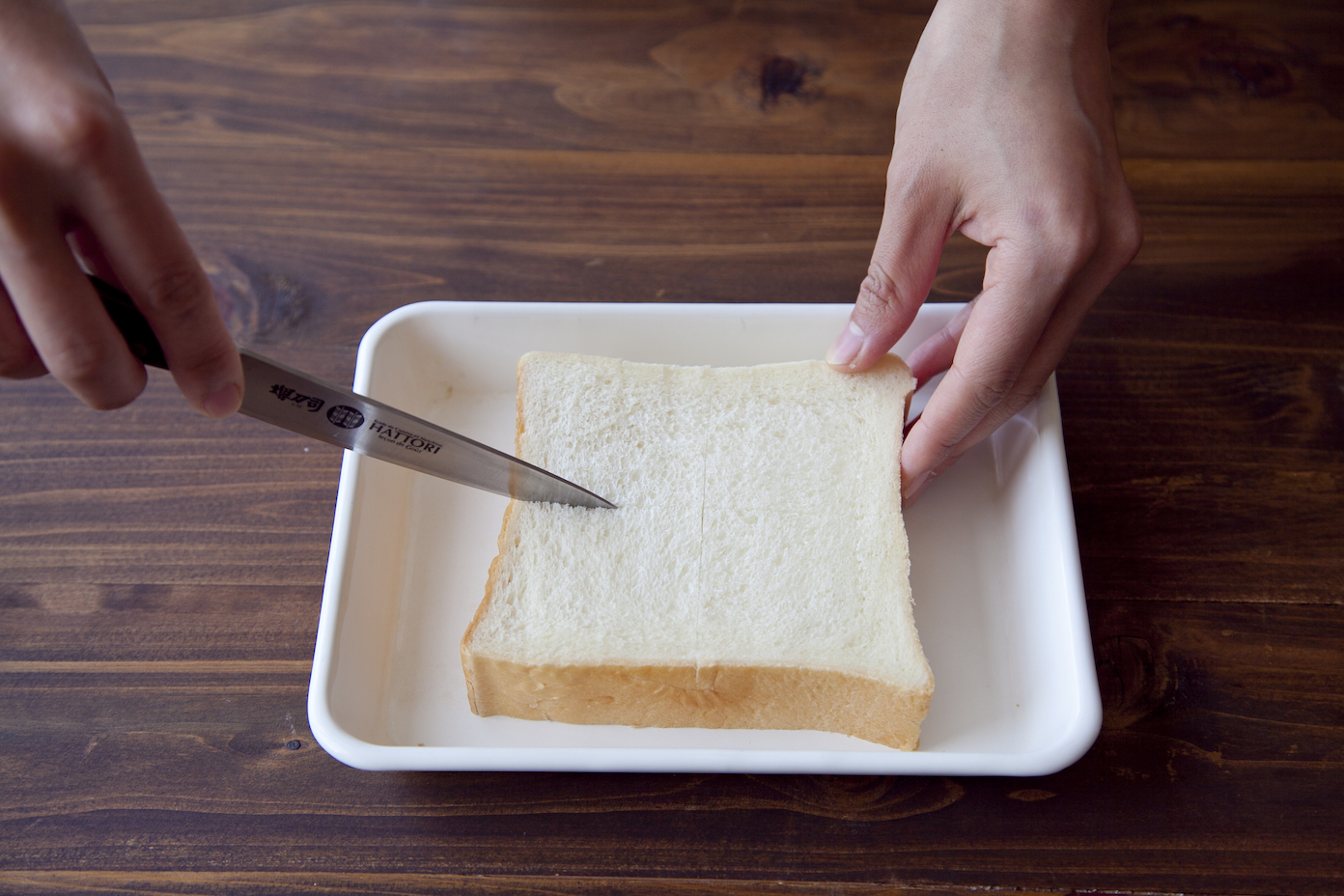 食パンに十字に切り込みを入れ、霧吹きをかけてから焼き色がつくまでトースターで焼く。