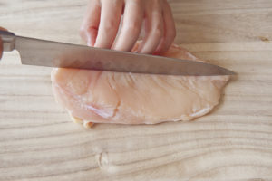 鶏肉を縦半分に切ってから、包丁をねかせて削ぐように切ります。
