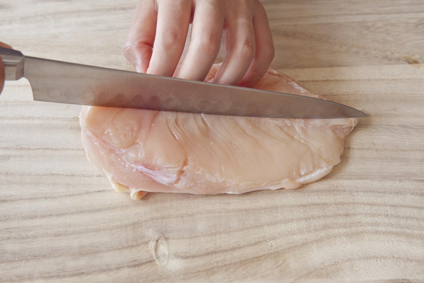 鶏肉を縦半分に切ってから、包丁をねかせて削ぐように切ります。