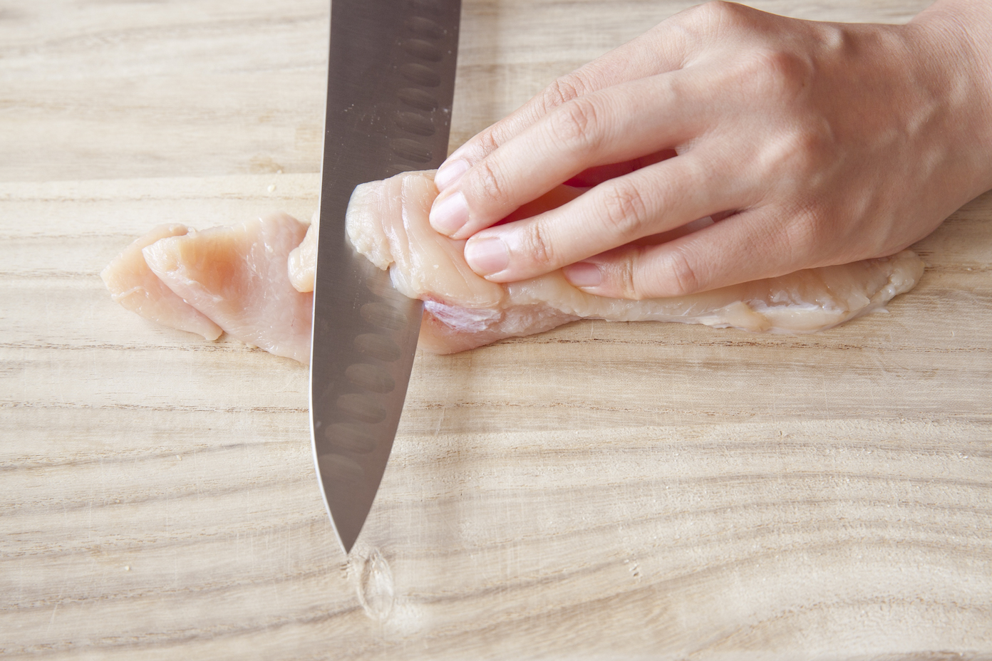 鶏肉をしっかりおさえておくと切りやすかったです。