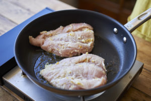 鶏肉を皮目を下にして入れ、蓋をして3〜4分焼く。