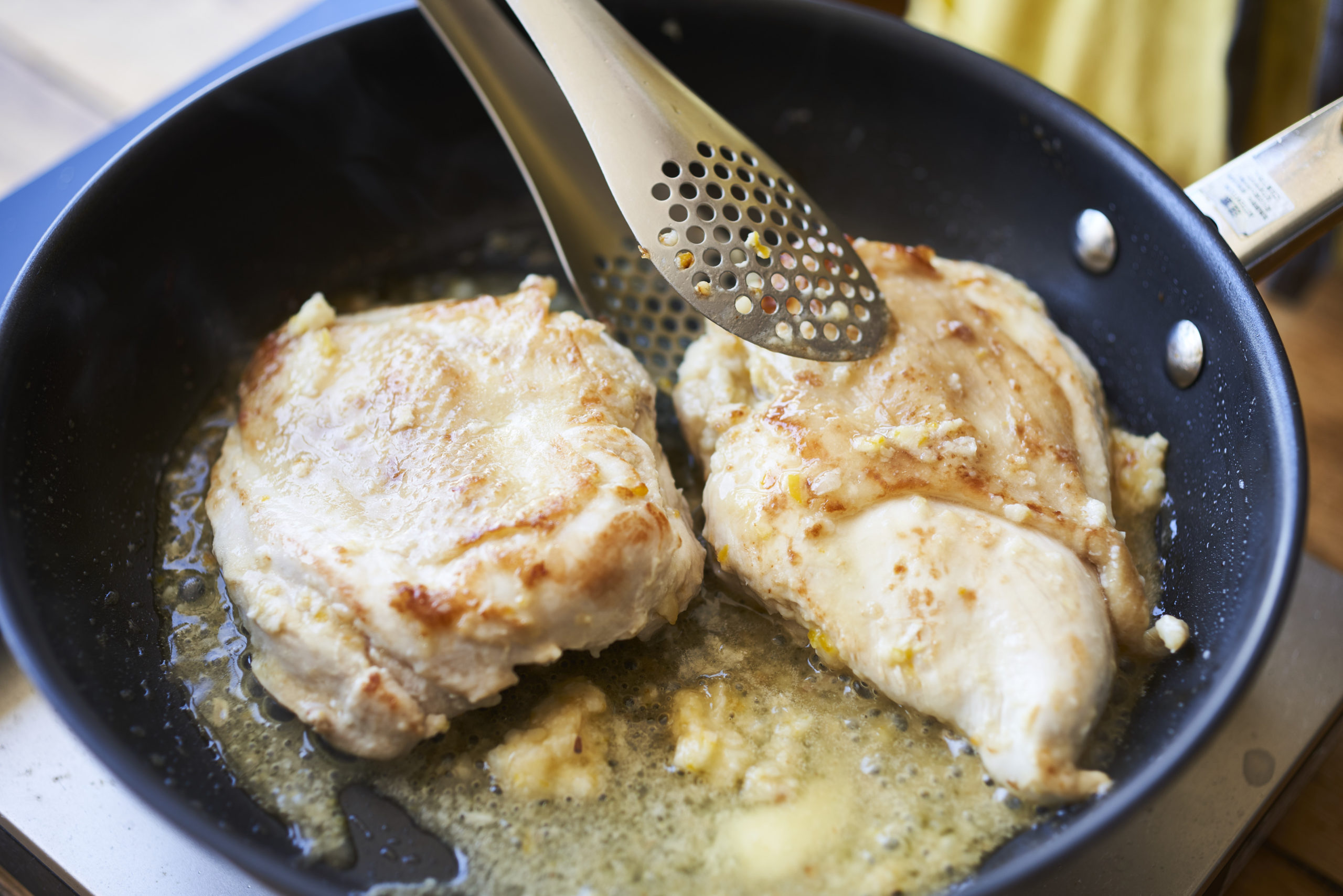 鶏肉を皮目を下にして入れ、蓋をして3〜4分焼く。