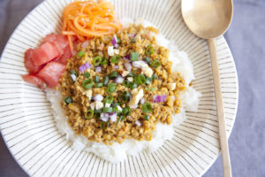 しょうゆ麹があれば加え混ぜ、器にごはんと一緒に盛り付ける。