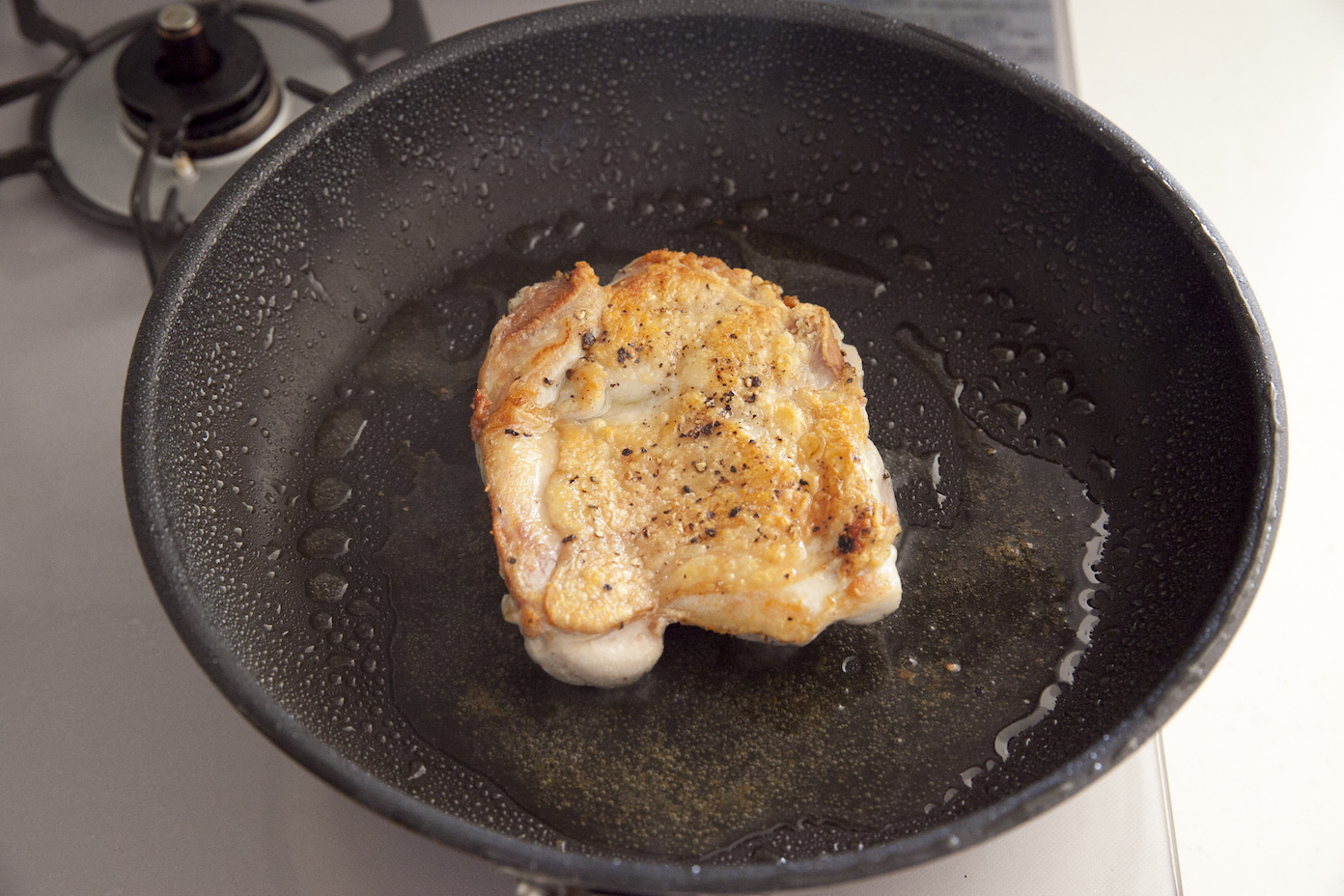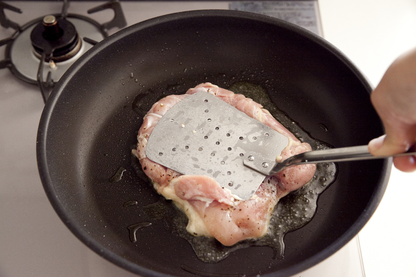 鶏肉はフライ返しで抑えながら焼くことで皮目がパリパリに仕上がります。