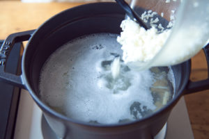 沸騰したら米を入れ、蓋を少しずらしてのせて弱火にし、30分程度加熱する。