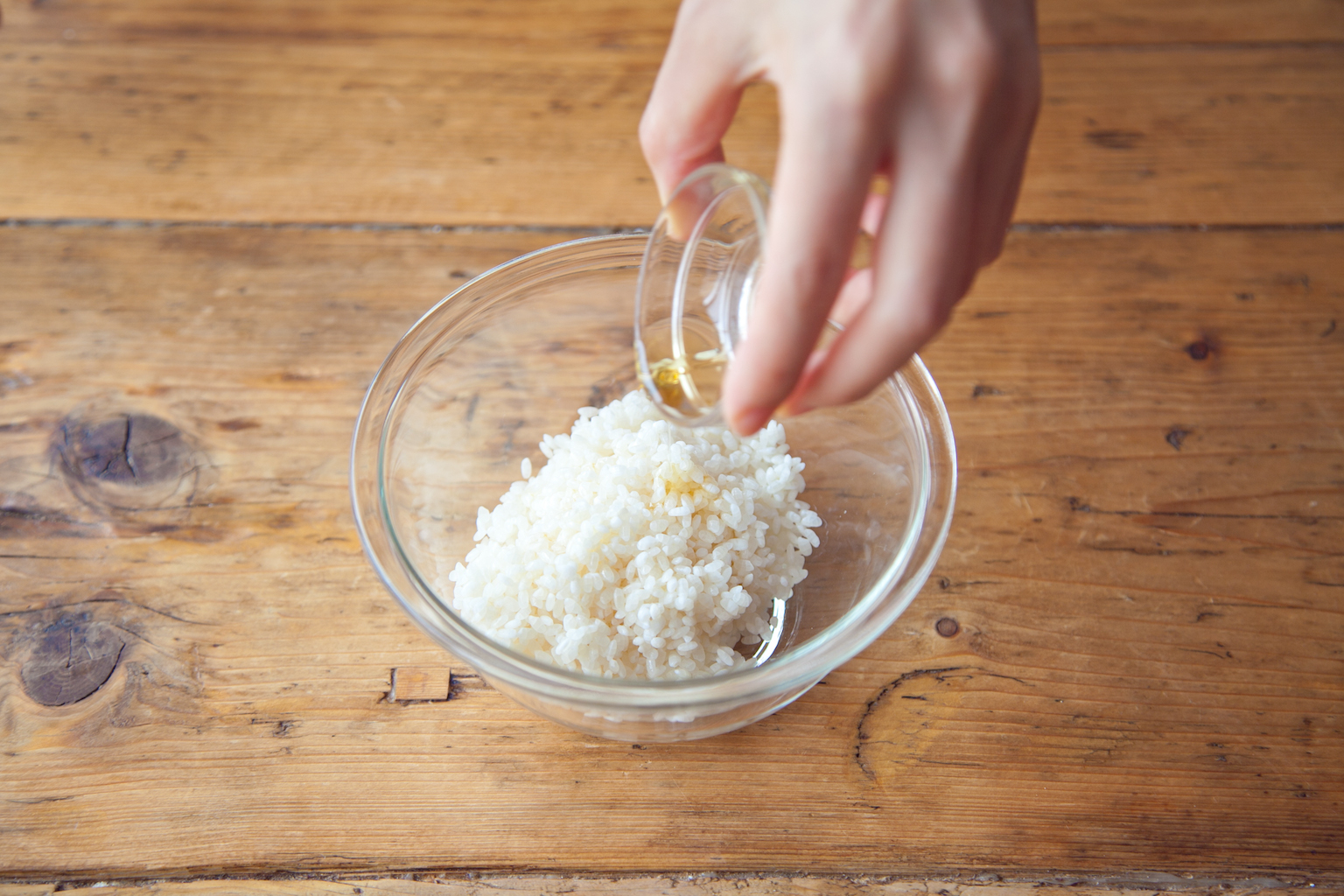 米は洗ってざるにあげ、15分ほどおいて乾かし、ごま油を絡める。