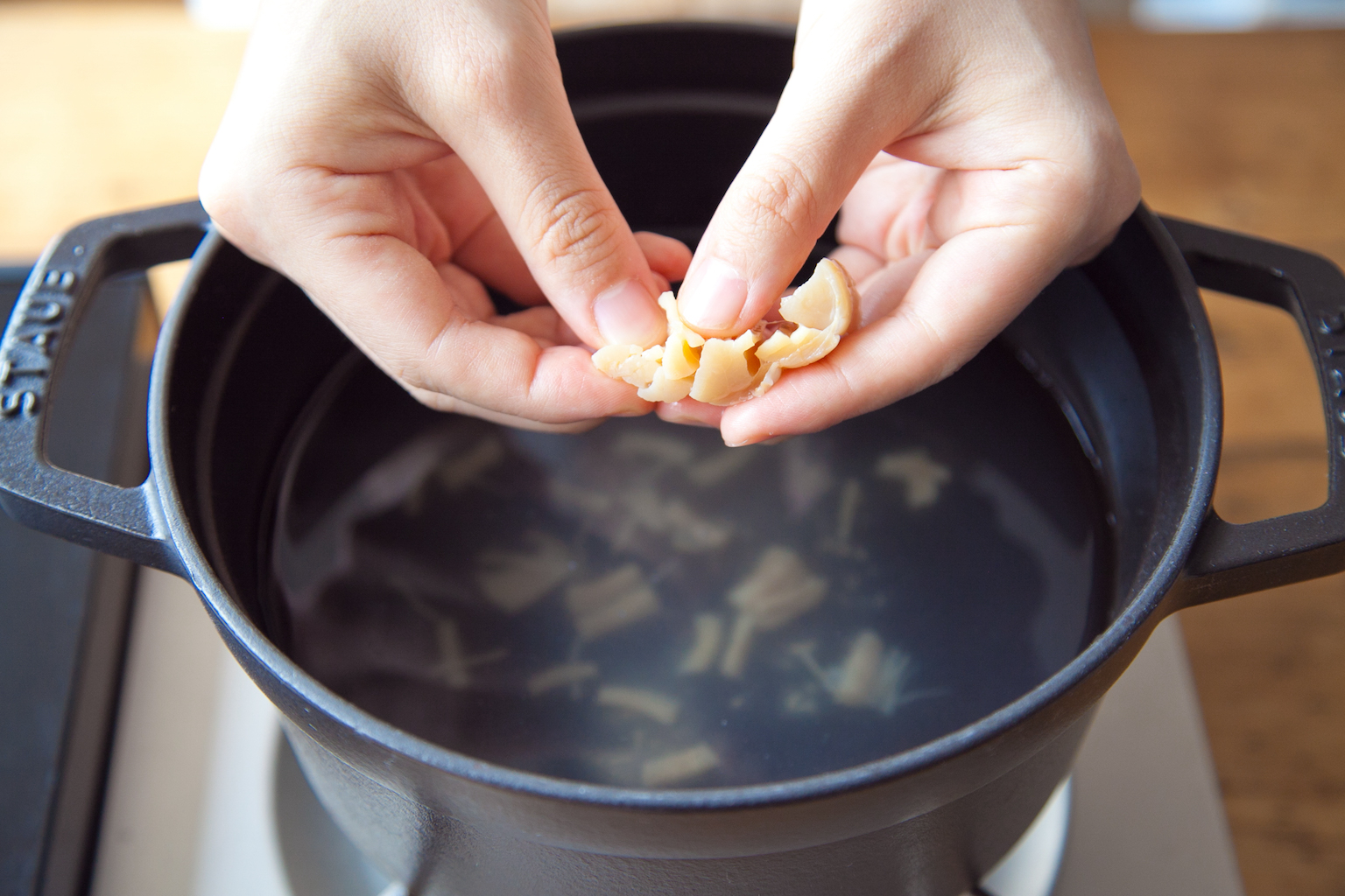 ・干し貝柱は一晩かけて戻すことでふっくら仕上がり、旨味も出やすくなります。