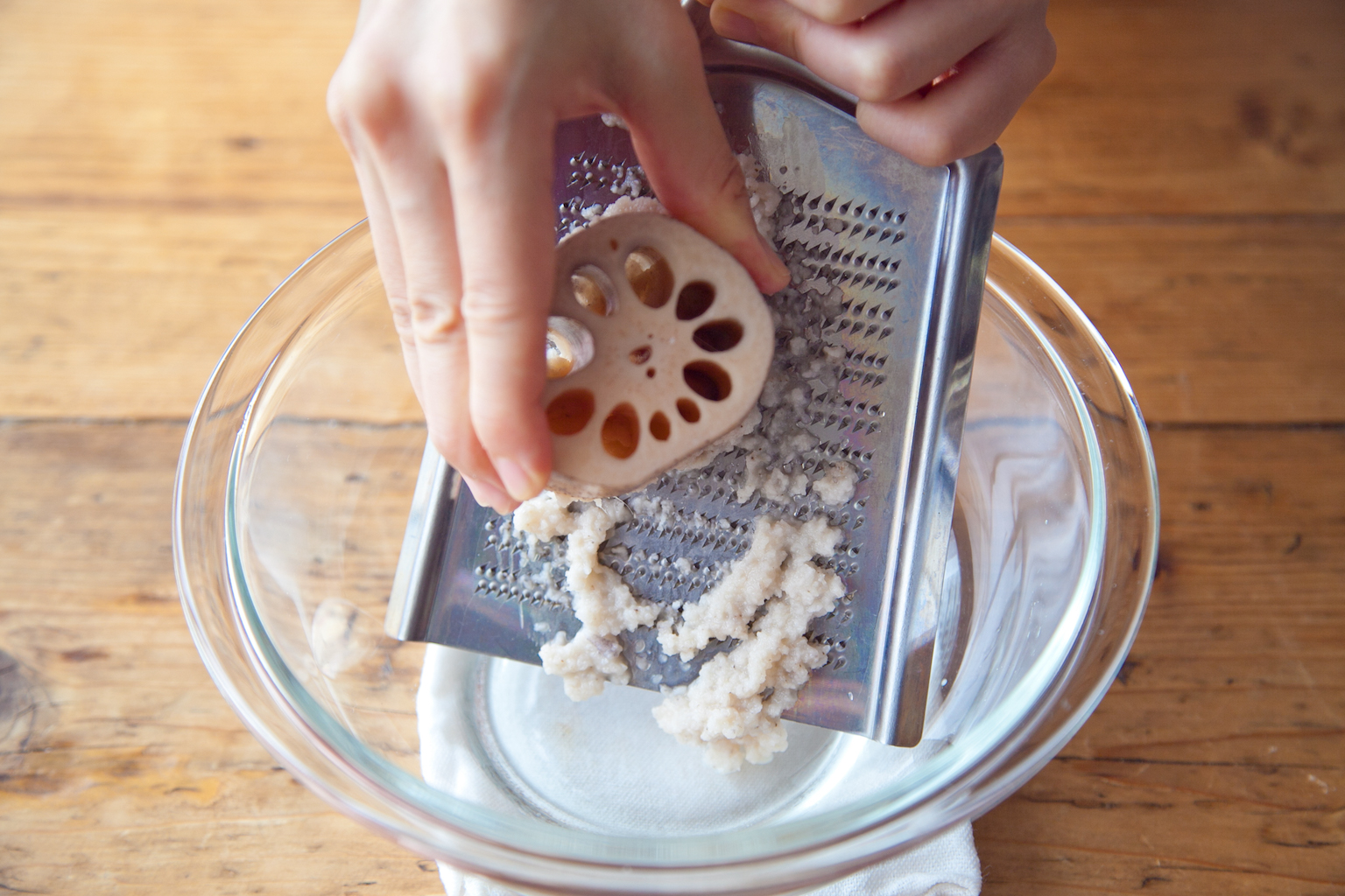 れんこんをすりおろして加え、さらに5〜6分加熱したら、塩を加えて味をととのえる。