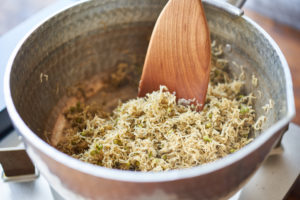 弱火にしてちりめんじゃこを加えて1〜2分加熱する。