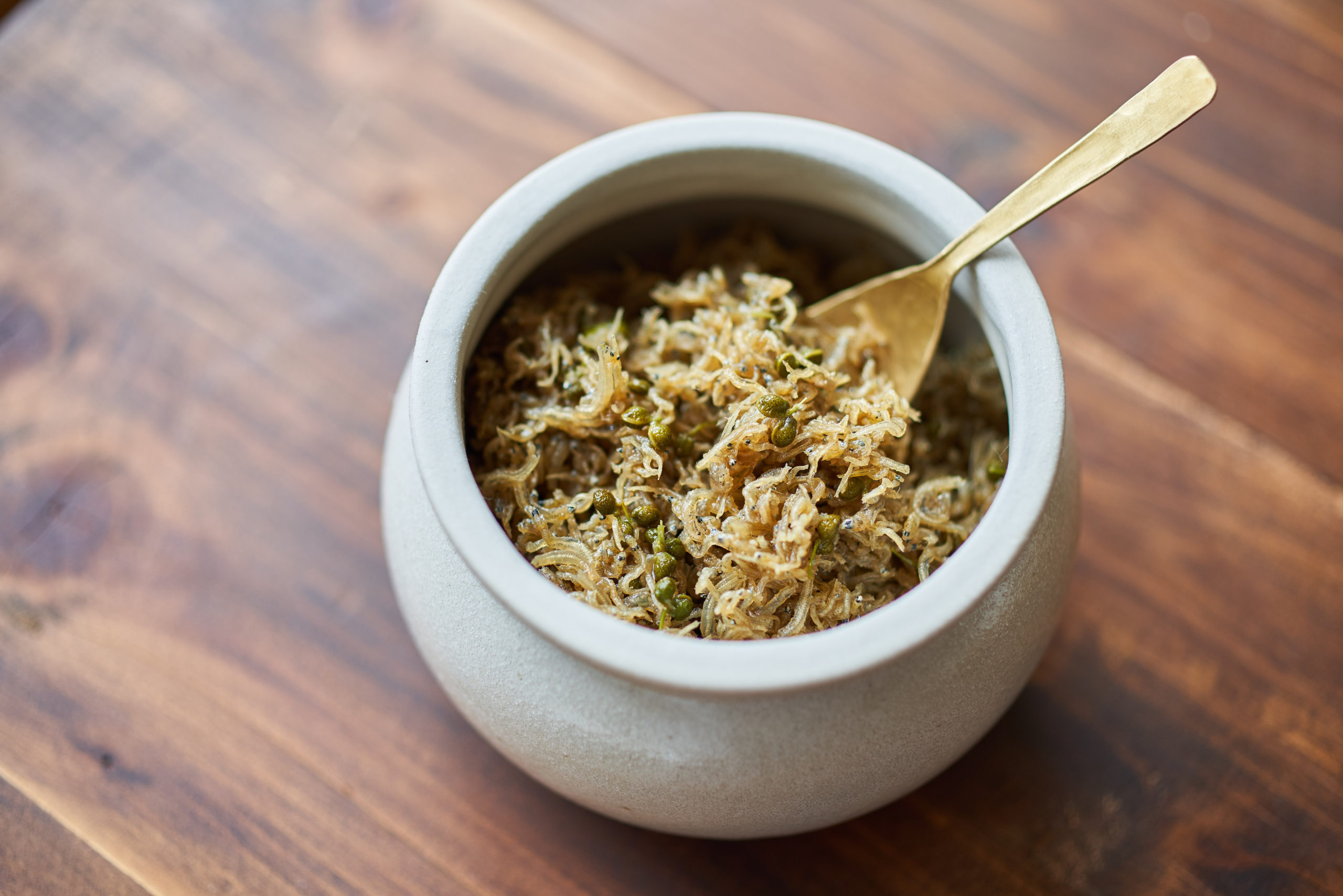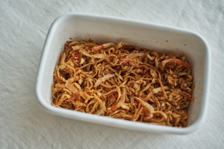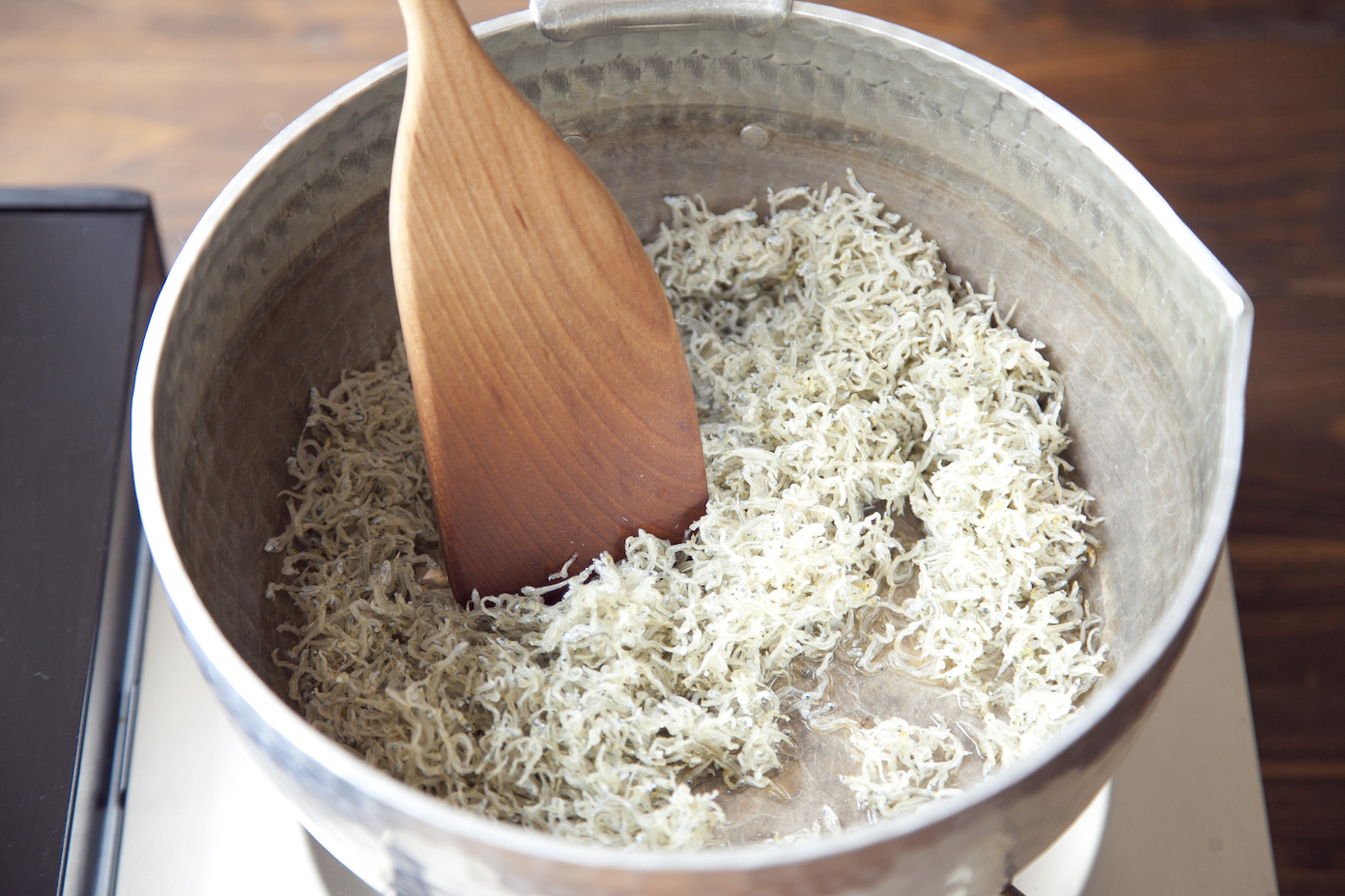 弱火にしてちりめんじゃこを加えて1〜2分加熱する。