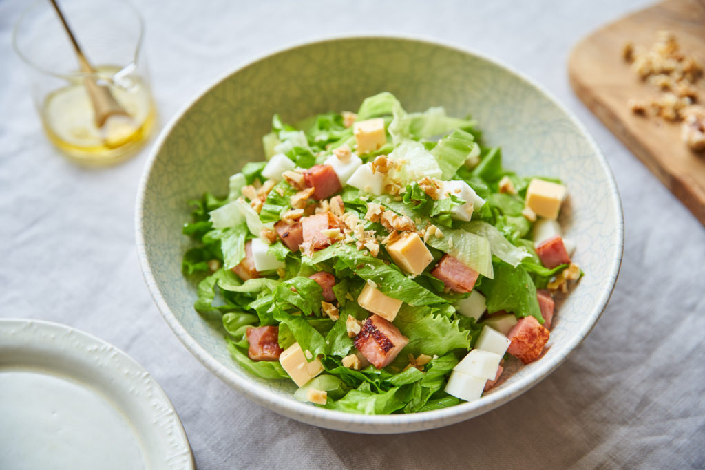 大きめに切ったチーズとベーコンのコクで食べ応えのあるサラダです。