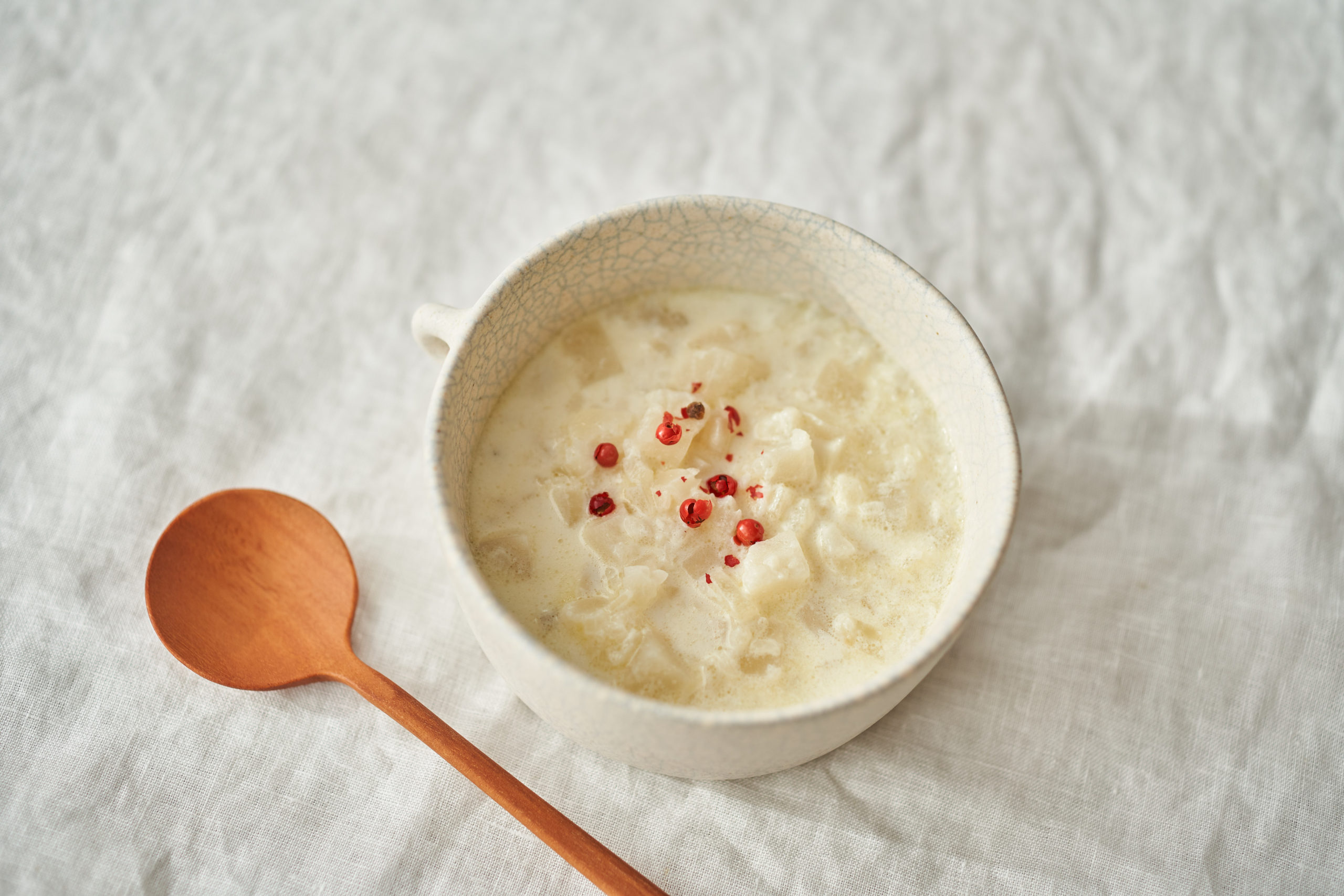 牛乳を加えて、あたたまったら塩で味をととのえる。